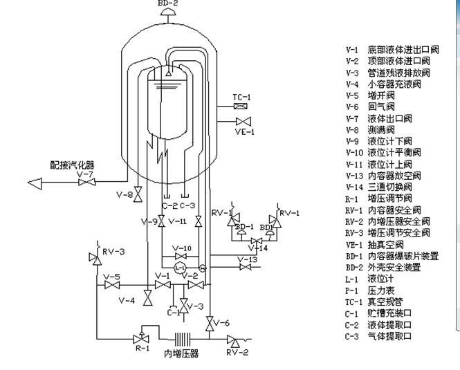 3.2.4檢查貯槽壓力是否正常,當(dāng)貯槽壓力接近或等于最高工作壓力時(shí),須打開(kāi)內(nèi)筒放空閥V-13泄壓。